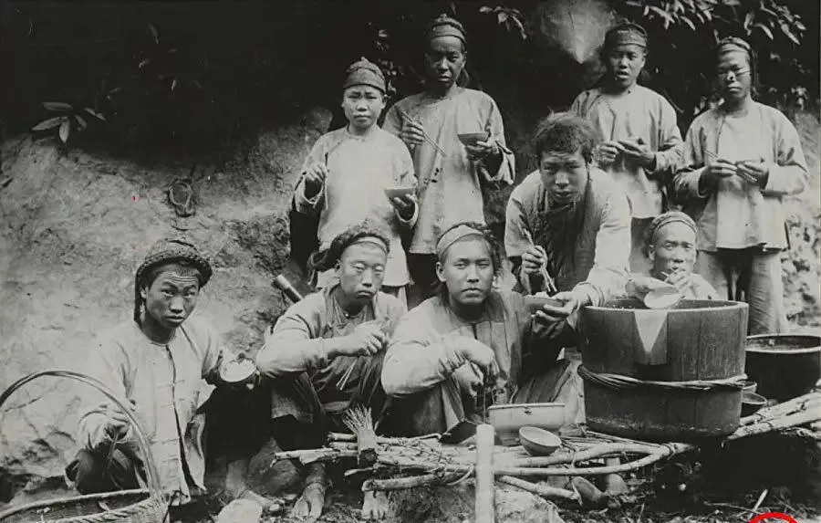 这个场景叫打尖,九个人围着锅台,手里端着大海碗,筷子抄得稳稳的,锅里翻着热气,旁边一只竹篮装干粮,几张脸都抬着瞧镜头,眼神里有点“这玩意儿会把魂儿吸走不”的发怵,忙活半天,啃两口糊米饭加咸菜,顶一下午工夫,以前填饱肚子是头等大事,现在呢,午休点个外卖就敷衍过去了。