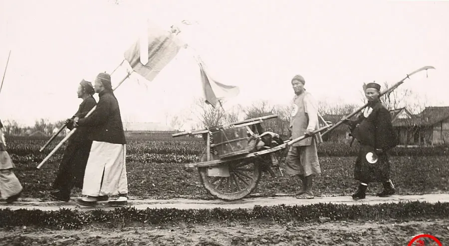 图中这支排场叫卤簿仪仗,旗幡高挑着,绣得花团锦簇,前有开道锣鼓后有随行差役,队伍在乡道边一转弯,尘土被旗角扫得直起,摄影师站得不远,能看清鼓面上画的日月星辰,都是讲身份的符号。