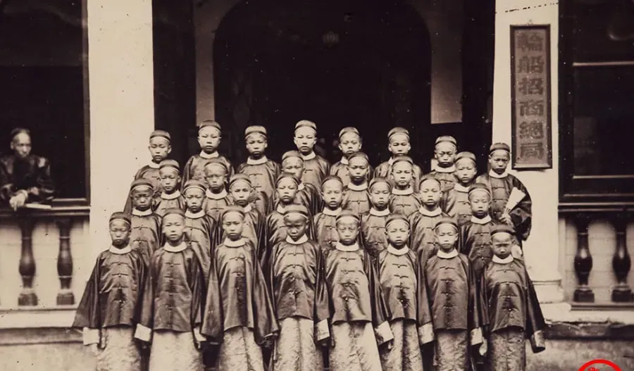 图里这群孩子叫留美幼童,统一的对襟长衫外罩短褂,袖口绣着细边,发髻束得紧紧的,站成三层人梯,神情有点板正也有点稚气,门柱上四个字写着招商总局,镜头按下时他们还不知道海那边的课堂是什么味道。