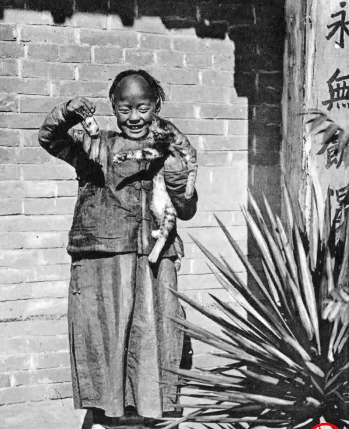 晚清老照片:小朋友逗弄猫咪场面温馨,总管太监性格温和低调。
