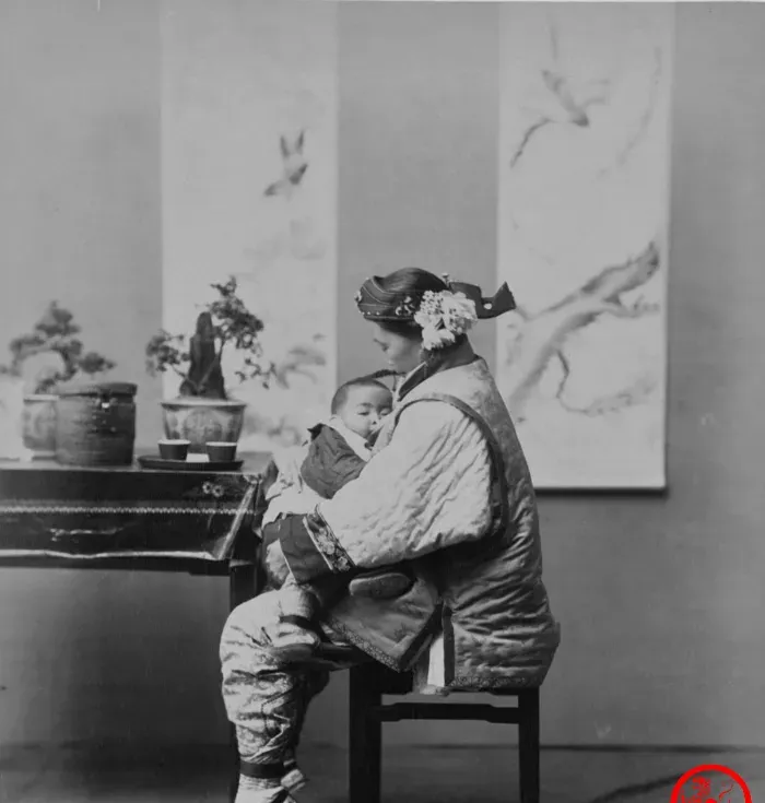 这位侧身坐着的叫抱娃的娘,厚棉袄把胳膊包得圆润,发髻后插了朵绢花,怀里小婴儿脸贴在衣襟上,半睡半醒,案上两盆小景把屋子点活了,奶奶说以前拍照是件正经事,先喂饱、再哄睡,等孩子不闹了才敢上镜,所以这张安生,不是摆出来的,是日子自己落下来的样子。