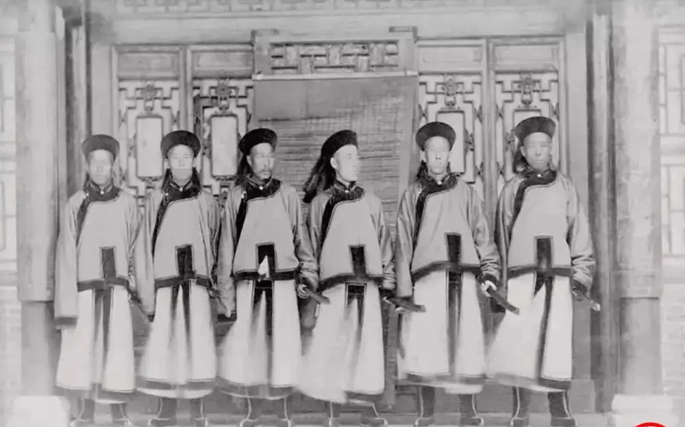 这个队列可精神了,帽顶压着,腰间佩刀,衣上黑色“十”字样的护片醒目,队形一字排开,脸上带股寒气,应该是护军校与蓝翎长那一挂的差事,奶奶说他们换岗走廊里靴底咯噔咯噔,一声比一声正,夜里听着心里都定。