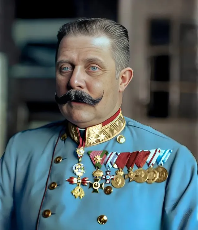 这个穿浅蓝军服的叫斐迪南大公,胸前一串勋章亮得扎眼,金边立领卡得笔直,八字胡梳得服帖,有点骄傲也有点疲惫,他是另一端的主角,坐车转弯时被命运堵了个正着,奶奶以前讲欧洲王公的故事总爱加一句,衣服再光鲜也挡不住背后的风,放到现在想想,这身行头像一面镜子,照出帝国最后的体面,也照出老世界的裂缝。