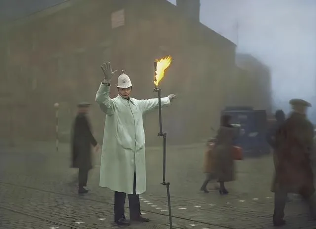 这个燃气小火苗立在街口,管它叫雾灯更顺耳,警察穿浅色雨衣,手举起来一道利落的边,火舌往上抬,照得对面路人脸上一层橘黄,伦敦的雾像是煮开的水汽,一锅没停过的火,照片一上色,冷里透着暖,我忽然想起小时候停电,妈妈在走廊点蜡,火光抖啊抖,我们就围着写作业,窗外一团黑,桌上却是能把心安稳下来的小亮。