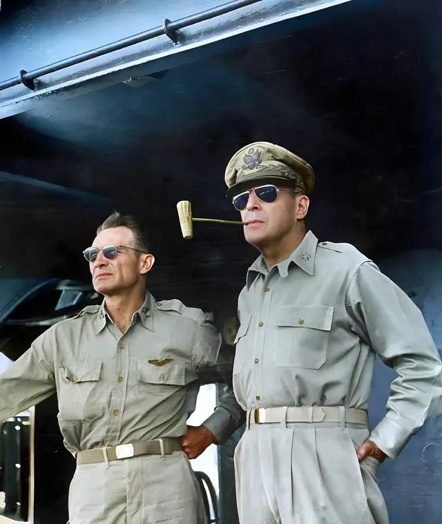 这两个军装男人站在舰边,目光往远处钉,右边那位嘴里叼着玉米芯烟斗,神气得很,风把袖口吹出一个角,海上颜色一层一层压过来,名字就不展开了,大家都知道那次回到海湾的场面,历史常常是这样,前一次狼狈,下一次就要挺胸回去,像我们小区老王搬家,第一次车卡在门洞里,第二次直接换大车,咔哒一下,心里那口气顺了。