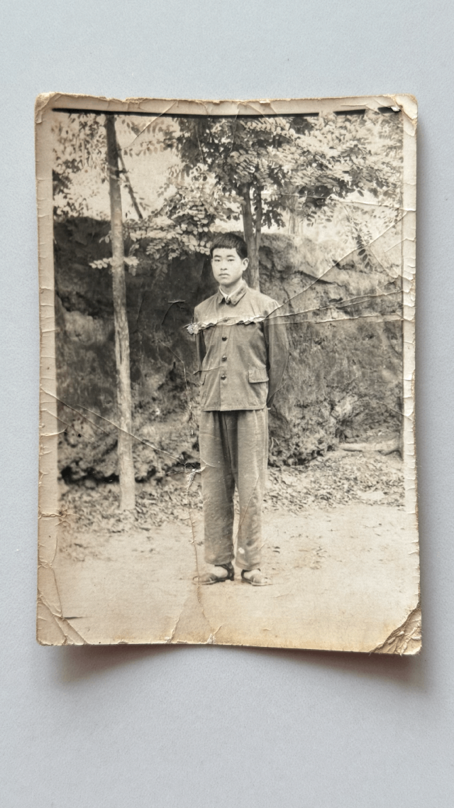 照片里的少年,穿着一身洗得有些发白的军装,站在学校西院的土墙前。路西的土坡上,几棵槐柳的枝叶在风里轻晃。他说,那时候读十三班,下课就爱往这土墙边跑,和同学哼着歌,看夕阳把影子拉得很长。