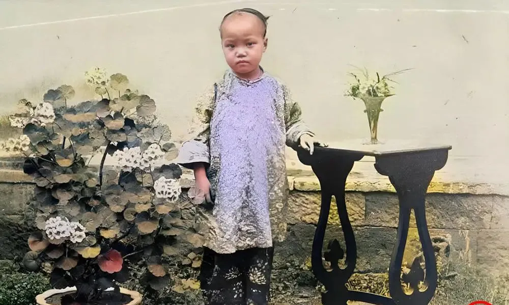 图中这个小家伙叫清末童子像,胖嘟嘟的脸蛋,前额剃了光,脑后蓄着一撮小辫,身上罩一件淡紫绣面的小褂,袖口肥肥,脚下是碎花裤腿,边上摆了个小几,几上插着细颈花瓶,孩子手背微微一翻,神情板着不太爱笑,老辈人说那会儿照相忌动,师傅吆喝一声别眨眼,孩子就这么绷住了,镜头把庄重也给定住了。