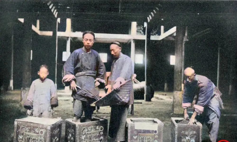 这个场面叫封装茶叶,木箱内壁刷了黑漆,师傅撩起裤脚直接站箱里用脚踩实,旁边人把帆布往里一折一压,茶末被踩得严严实实,方便上路,妈妈说早年的茶要“洗一洗”,不是讲排场,是担心工序里混了灰,时代一变,流水线和不锈钢上岗了,规程一厚本,脚底板也就退出了车间。