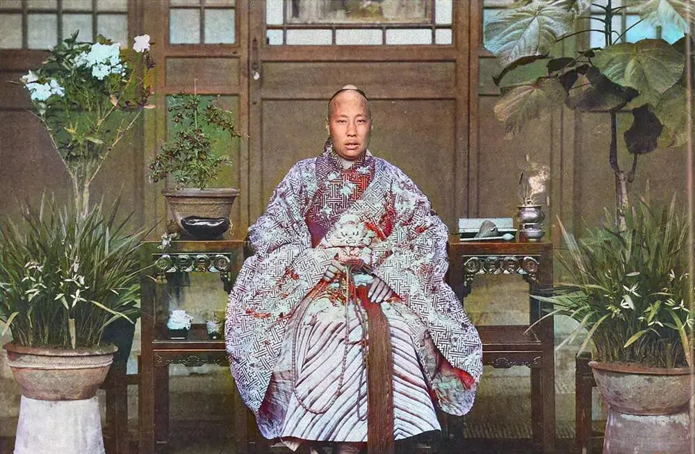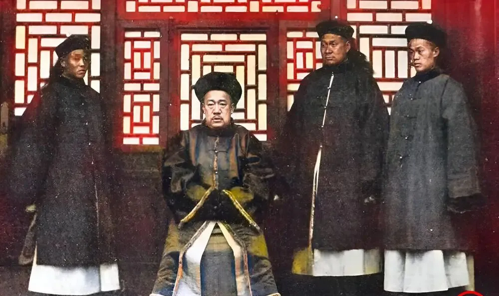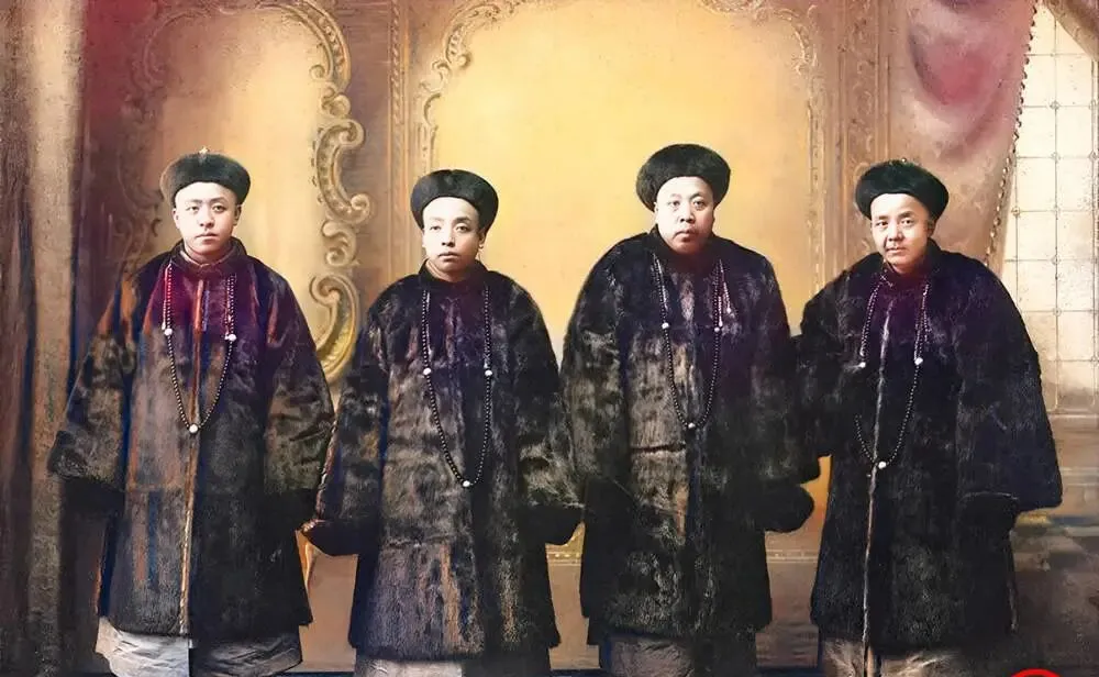这张合影里坐着的叫王府主人,披着深色官袍,袖口宽大,膝间压着厚实的褶裥,身后站着三位随侍,帽顶乌亮,脸上神气却不敢越雷池,老照片里权势的分寸都写在站姿上了,坐与立、前与后,一眼分明。