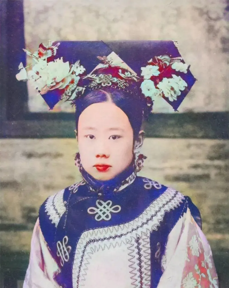这个夸张的头饰叫礼冠,宽肩的硬翅两侧插满绢花和银饰,衣领处盘着细密的结纹,深蓝衬底把白皮纹样衬得更精神,小姑说看着沉吧,其实梳得紧才稳当,坐久了脖子发酸,那会儿讲究的是体面,出门一身行头就代表整门脸面,现在的新娘头纱轻巧自在,谁还愿意头顶一座“花园”。