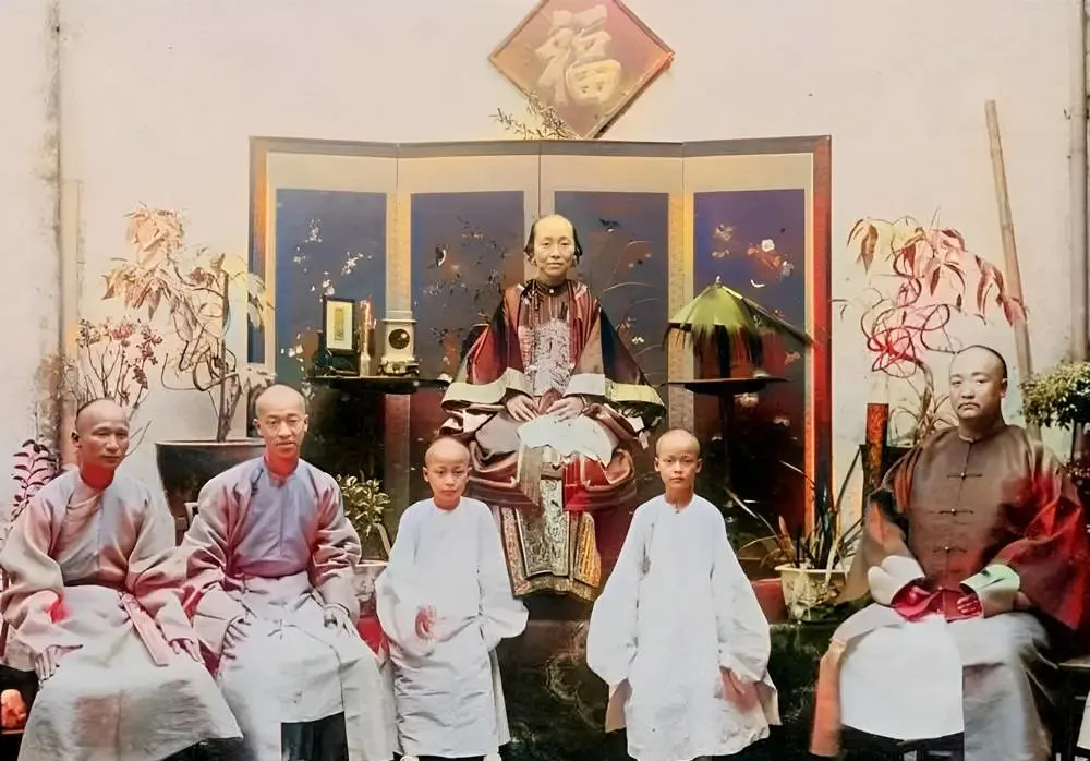 晚清彩色老照片:皇宫太监衣着华丽,全家拍合影女主人高高在上