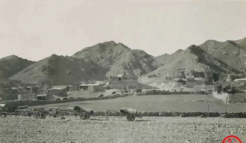 图里这一排推车叫独轮大车,木架子细长,前头一只大木轮子居中撑着,车帮子上还钉着铁皮加固,装粮装柴都靠它,赶车人两边扶把,走起土路来哐当哐当的响,爷爷说这车会挑路走沟沿,省力不压地,现在机动三轮一轰油门就过去了,那会儿就靠两条腿配一只轮。