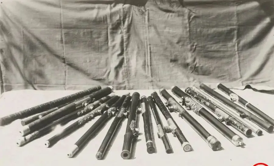 这个长条条的家伙叫烟枪,竹节的,乌木的,象牙嘴的,花嵌银包的,摊在布面上像一溜儿黑鱼,管子肚里空着,烟盅在侧,火籽一凑就能吸两口,看着精致,其实就是把人抽空的玩意儿,以前有人还拿这物件显摆,现在想想真不是体面事。