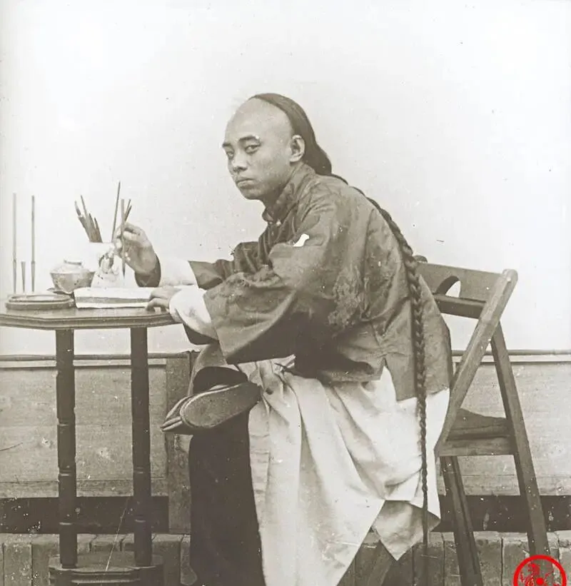 这个坐在折椅边的人在练字,手里捏着狼毫,墨碟靠着小圆几,最打眼是那根辫子,顺着肩头直坠到地上,像一条黑蛇,他把腿搭在另一条腿上写,姿势里有点倦懒,像被人喊来摆拍的,爷爷看这种照片总摇头,说“写字就得端,手稳心才稳”,他那套讲究,现在孩子们听着都像古董。