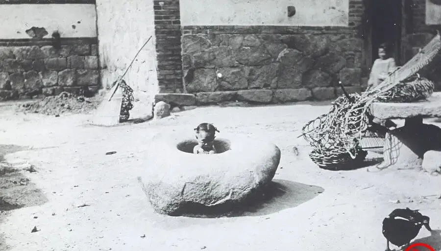这口石臼个头不小,肚皮鼓圆,口沿被年头磨得发亮,孩子蹲在里面当了个“石缸娃”,旁边晒着箩筐和耙子,小时候我们家也有一口,捣蒜捣椒,夏天还往里灌凉水泡黄瓜片,咸咸脆脆的味儿一下就回来了,现在厨房电动一通,石臼却不好找了。