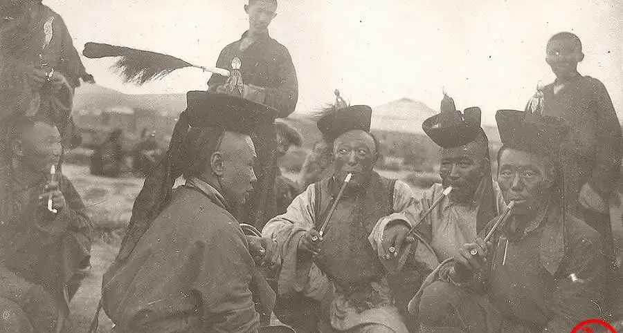 这几位手里的长家伙叫旱烟杆,铜烟锅小小一撮,杆子细长,末端裹着布,好叼稳,围坐的男人们辫子粗粗垂在背上,一吸一吐像打合唱,爷爷说,赶牲口赶了一天,挨着地蹲下,点上火就算歇了,烟袋磕在靴帮上,清脆一声,夜色也跟着落下来了,现在谁还这么慢吞吞抽烟,打火机一摁,三五口就走人了。