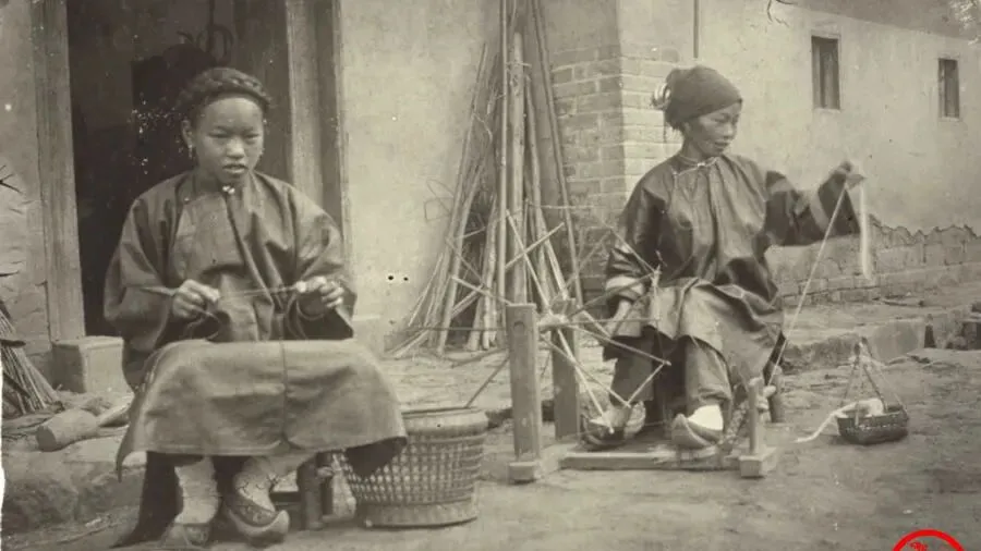 这个脚下踏板手里牵丝的器具叫纺车,木轮乌黑发亮,轴头上缠着细细白线,左边姑娘攥着纱头盯得紧,右边那位抻线一拽一放,篮筐里是还没捻好的棉花团,妈妈说以前姑娘学活路,针线纺织是基本功,不会可要被婆婆嫌,现在逛商场一件毛衣十分钟挑好,回家把吊牌一剪就穿,省心是省心,手下那点巧劲儿也就越来越少了。