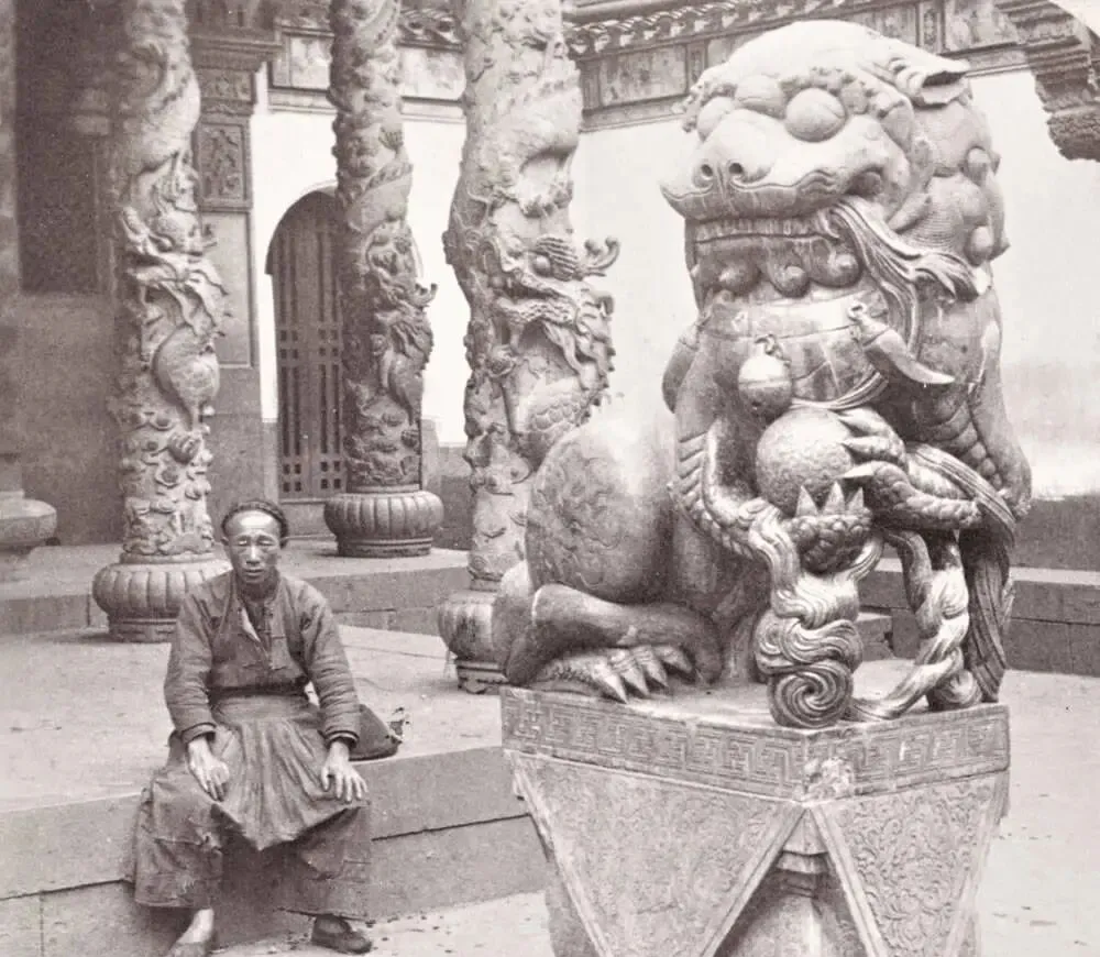 这位坐在台阶边的老先生,袍子破了个小口,脚背露在外头,手搭在膝上不说话,石狮的眼珠子圆圆的,像在瞪他,其实不过是守着门,守着几百年的香火,我想起一句老话,人老守旧物,旧物守旧城,谁也没离开谁太远。