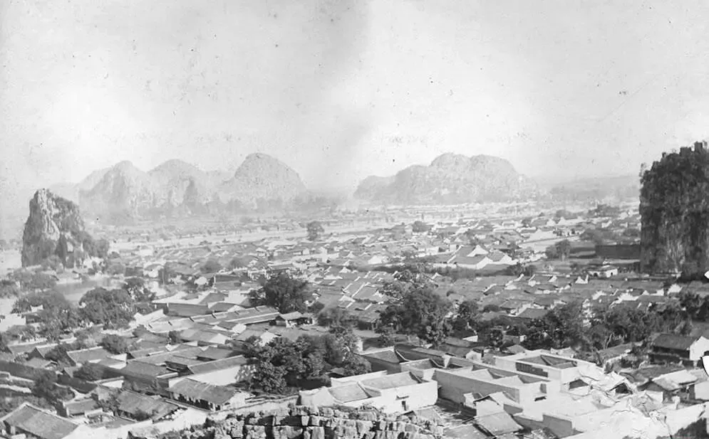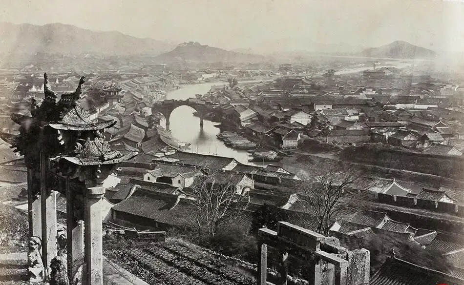 这个开阔的视角看过去,城里屋脊一溜接一溜,远处的石山像从地里蹦出来的,水道在城边打了个弯,烟雾把天边擦得白白的,诗里说千峰环野立,一水抱城流,站在这照片前,我竟听见屋瓦热胀时轻轻“咔”的一声,很小,却把时光敲醒了。