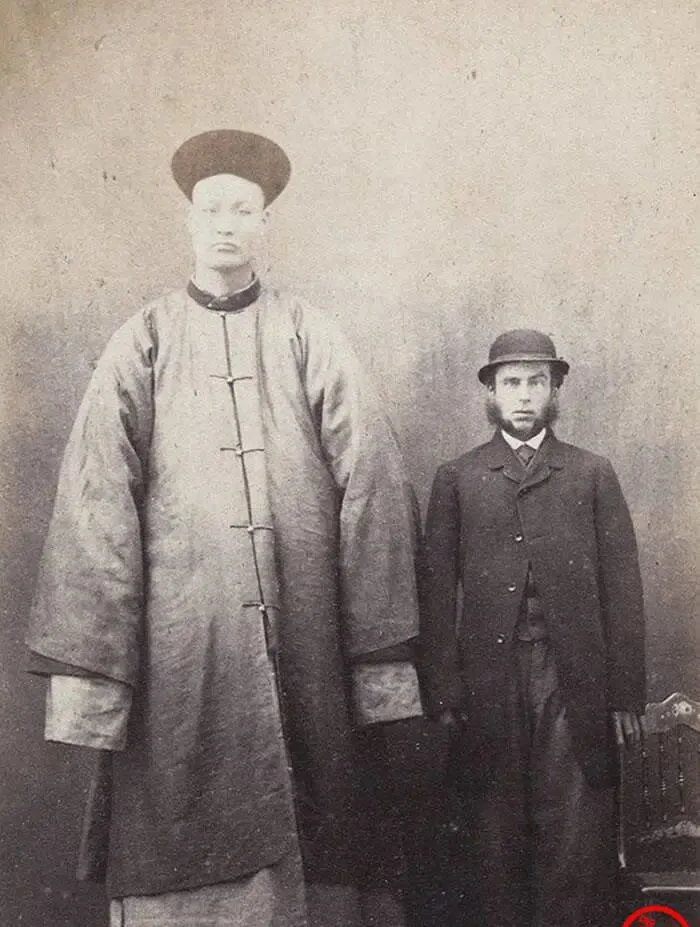 这个高个子叫詹世钗,站在旁边的西装男子只到他胸口,长袍往下一垂,袖子像两道瀑布,肩线撑得直挺,听说他那年才二十来岁,个子已经窜到两米开外了,我看着这张对比图就想笑,又有点酸,老天给的身量是礼物,也是担子。