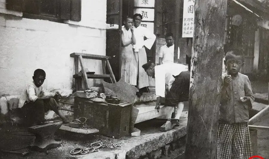 这个叮当作响的铺子就是铁匠铺,风箱皮囊一鼓一瘪,火苗呼一下就窜高,铁块烧到樱桃红放在铁砧上,锤子连着点儿敲,铆钉冒着火星子飞,师傅抬头说再来两口风,少年在一旁拉风箱,抿着嘴不敢喘粗气,现在想钉耙了就上网买,那时全靠这里的火把活气敲出来。