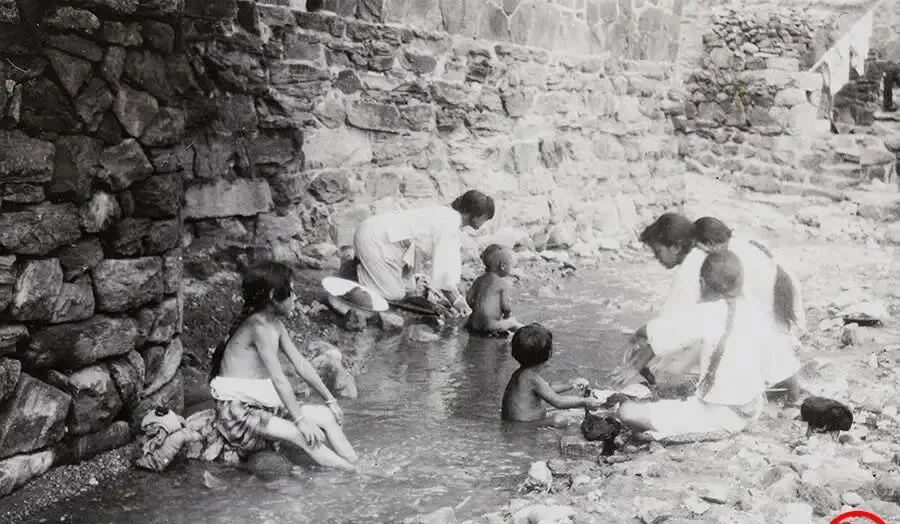 这个拍打衣裳用的板子就叫搓衣板,妇人蹲在溪边,手里拿着木瓢一勺勺舀水,孩子们在上游扑腾着玩,水花溅到石阶上亮晶晶,奶奶说以前洗衣讲究择晴天,衣裳要在风里晾到发脆才收,现在有洗衣机一按就转,溪流也被保护起来不让洗了。