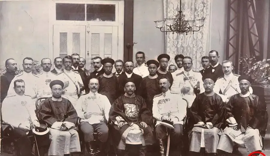 这张大合影里人挤人,前排坐着一圈胸口挂章的军官,后排站了一溜黑帽子和白制服,正中那位你一眼就能看到身段挺阔,他便是直隶总督袁世凯,那几年列强驻兵在眼皮底下,局势紧得很,他只能笑脸相迎,左一句客气右一句请多关照,妈妈说有时候低眉是为了活路,这话放在哪个年代都不难懂。