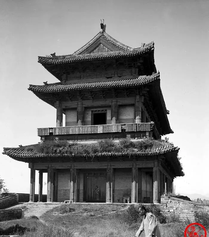 这座三层的城楼叫安定门,檐角翘起得漂亮,近看却处处是裂缝,女儿墙上青草从缝里探头,城台下一人背手而行,显得楼更高了,城门本该护着一座城,那时却已经破败,外公说打小在这儿玩过捉迷藏,拾级而上灰尘扑脸,现在城楼多修护得精神了,可别忘了它们也经历过风刀霜剑。