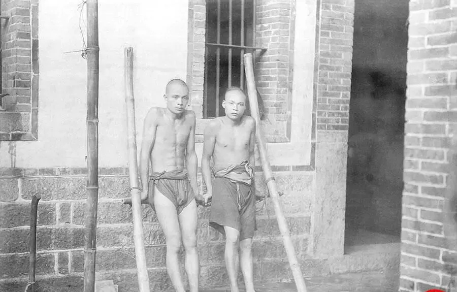 这三个赤膊男子脚上套着木枷板和铁镣,站与蹲的姿势各不相同,后巷阴影里潮气往外冒,一个人眼神里空得厉害,像刚从长夜里醒来,监狱的味道我不想多记,只有链条磕地那声叮当,隔着岁月也让人后背发凉。