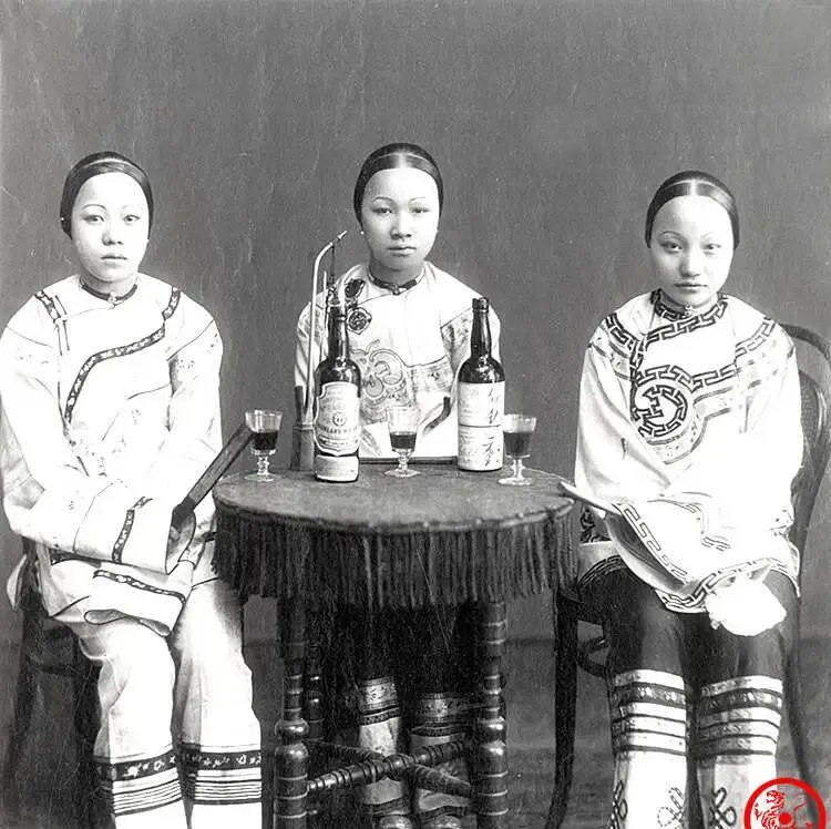 图中三位姑娘叫闺秀照,额前中分的油光发,贴头挽起一个小髻,身上是修身袄裤配绣花云肩,袖口边沿一圈一圈的盘金线很显眼,桌上摆着两瓶洋酒和三只高脚杯,都是道具,那会儿能摆到镜头前的洋物件,本身就是时髦的招牌,摄影师让她们别笑,端着就行,表情越淡越显矜持。