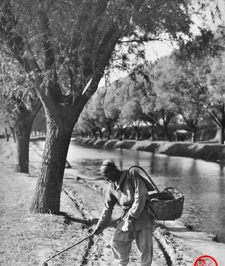 这背着竹篓的身影叫拾粪人,肩上的粗麻带勒出深痕,手里铁勺一个弯钩,沿着河埂慢慢刮,干成饼的就顺手铲起放进篓里,太阳一偏,影子被柳树切成一段一段,外公小时候也干过,说一篓能换回盐和灯油,没有化肥的年代,全靠这点力气攒庄稼,现在村头都是机耕车,地里肥袋子成捆放。