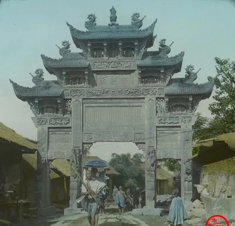 1917年四川彩色老照片:害人的孝节牌坊,瘦骨嶙峋的卖油翁。