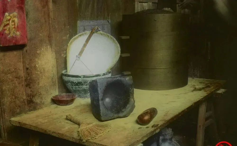 这个黑疙瘩是石臼,边上圆圆的木锤叫杵,后面一摞高高的是木蒸屉,靠墙那口青釉大瓮里泡着豆子或酸菜,案上散着糠粉,手一抚就是糙糙的,外婆做年糕,就把糯米倒进蒸屉,腾一层雾出来,屋子立马有了过年的味道。