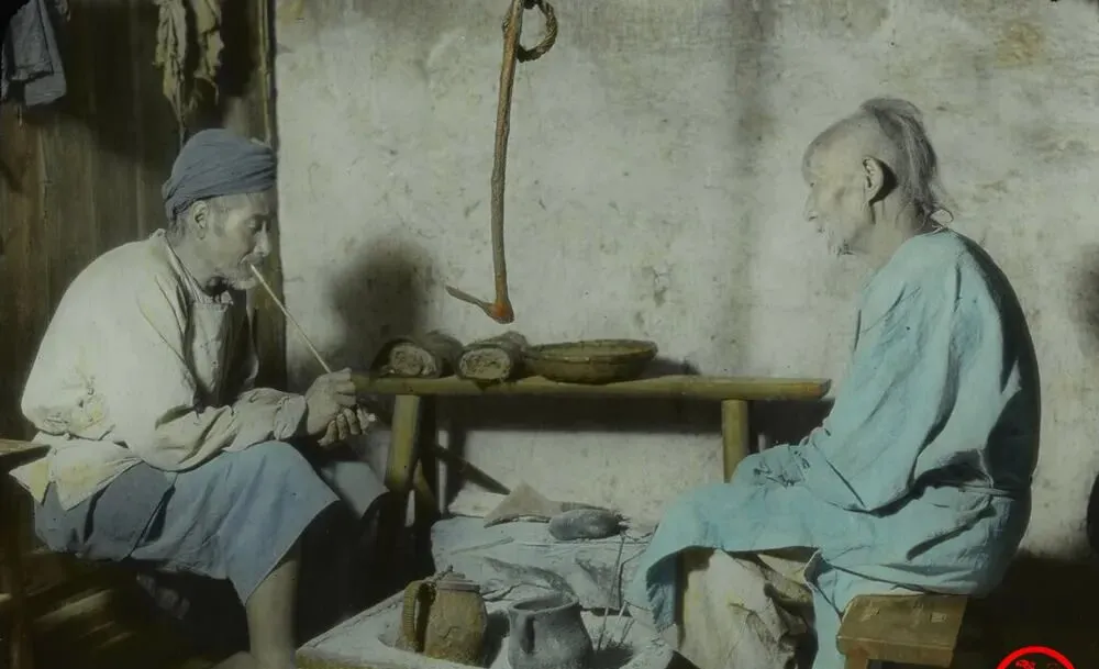这个细长的叫烟袋杆,前头铜嘴,后头木柄,桌上摆着泥壶和两块干粑,墙上吊着一根弯木杖,右边老人还留着半截辫梢,显得格外扎眼,外公看这张图就说,晚清的人改不掉老法儿,手里摸着烟锅,心里还惦着旧朝的规矩,现在谁还肯这么慢条斯理装一锅烟呢。