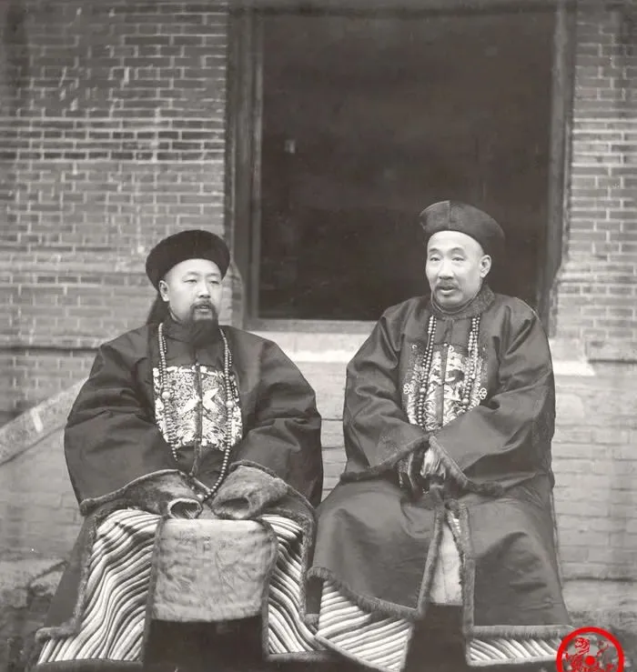 图里这身行头叫补子官服,胸前绣着飞禽走兽,绸缎底子厚实发亮,外面披的氅衣边上压着一圈毛,坐着的两位手上戴朝珠,膝上搭着条纹马褂,门洞黑漆漆的,衬得人更稳重,这种照片多半是照相馆里摆了凳子请人端坐,讲究的是个气派和正经。