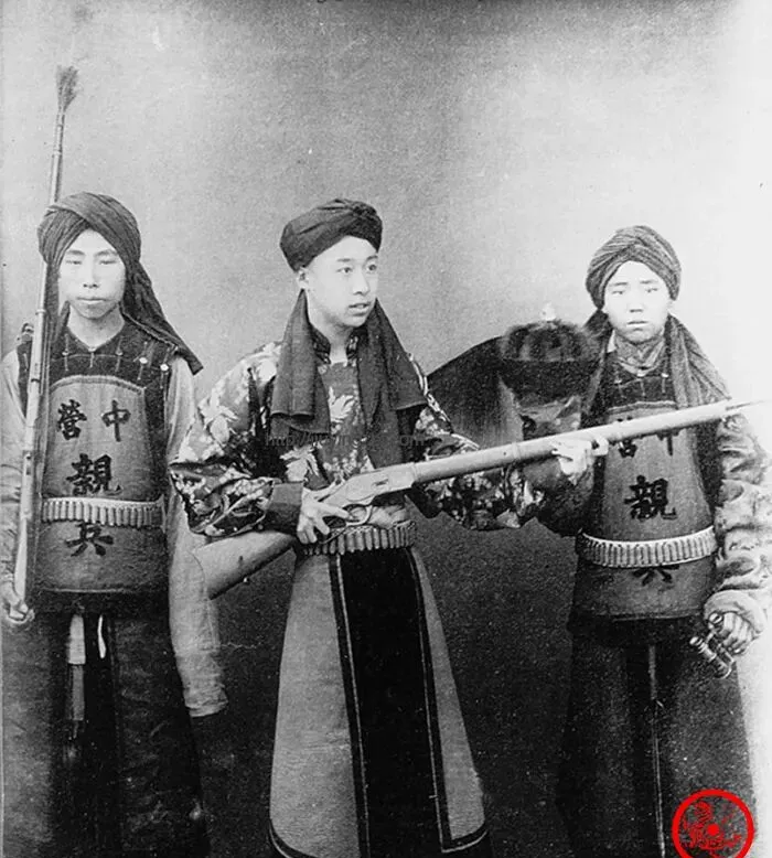 这个长枪叫温彻斯特连发,那会儿人给它起了个外号十三太保,一条子弹带斜挂在腰上,木托泛着油光,三个年轻兵丁胸口的马甲上刷着大字,边上那位手里还抓着望远镜的带子,这些小细节都说明了,新式火器来了,可兵的脚上还是布鞋,身上罩的还是棉布罩衣,时代就这么半新不旧地拧在一起。