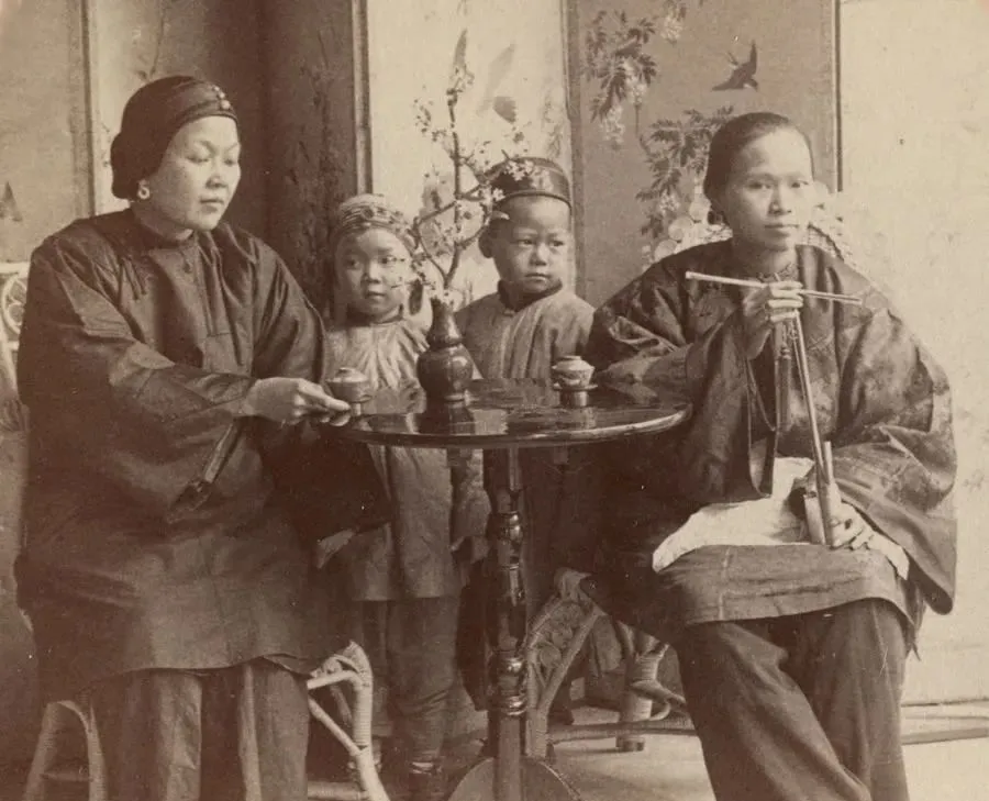 这个长长的细管叫水烟袋,铜头乌亮,细竹杆儿顺手搭在指缝,圆圆的水胆放在桌面,旁边还搁着个小盏,大人们话不多,就一吸一吐地慢慢过日子,两个孩子怯生生地往镜头看,奶奶见了这张老照片总念叨,过去女人屋里坐,男人在外头跑,现在可好,谁忙谁说了算。