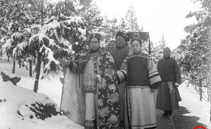 这个场景叫颐和园观雪,披风上大朵绣花密得见不着底子,身边挤着宫里人,前后两层人影把中间那位衬得更显眼,树枝压着厚雪,鞋底在石路上踩出深深的印,照片静,可风好像在吹,奶奶说老北京下了雪,院里先扫出一条小路,热气从袖口里往外冒,现在我们遇雪第一件事是拍照发圈,那时候人家只顾着把脚下站稳。