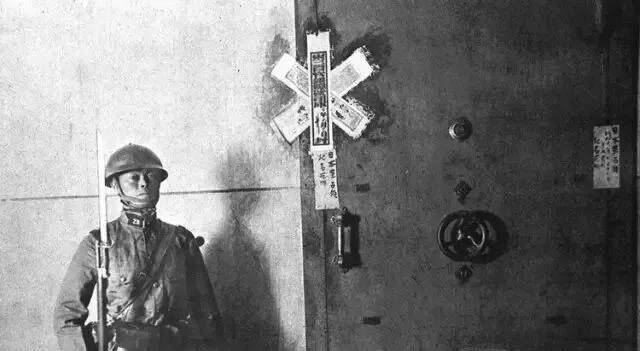 这个厚门叫金库门,铆钉一颗颗鼓起来,正中两条封条交叉贴着,日本兵端着枪在旁边站岗,门把像一只黑亮的车轮,外公说金库里头冷得很,地面是石板,走两步鞋跟都回声重重,现在手机里转个账就能汇千万,以前银元得一袋袋抬,门一合上,外头就只剩“当值”“封存”这几个字了。