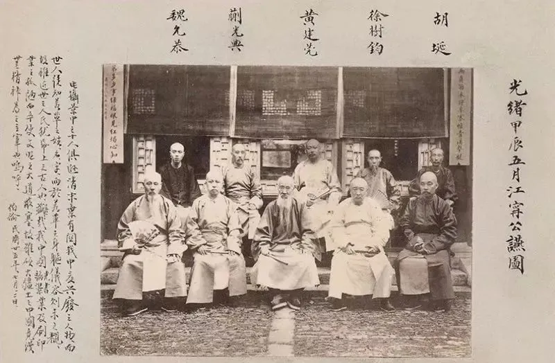 图中这张叫“光绪甲辰江宁公宴图”,木窗格子后是江安粮道署的正房,前排五位衣纹铮亮坐成一线,手里折扇团扇各有分工,地上石板被雨水养得黑亮,像刚擦过油一样,边上还有题字,写得清清楚楚,说这一桌十个人都和国是兴废挂钩呢。