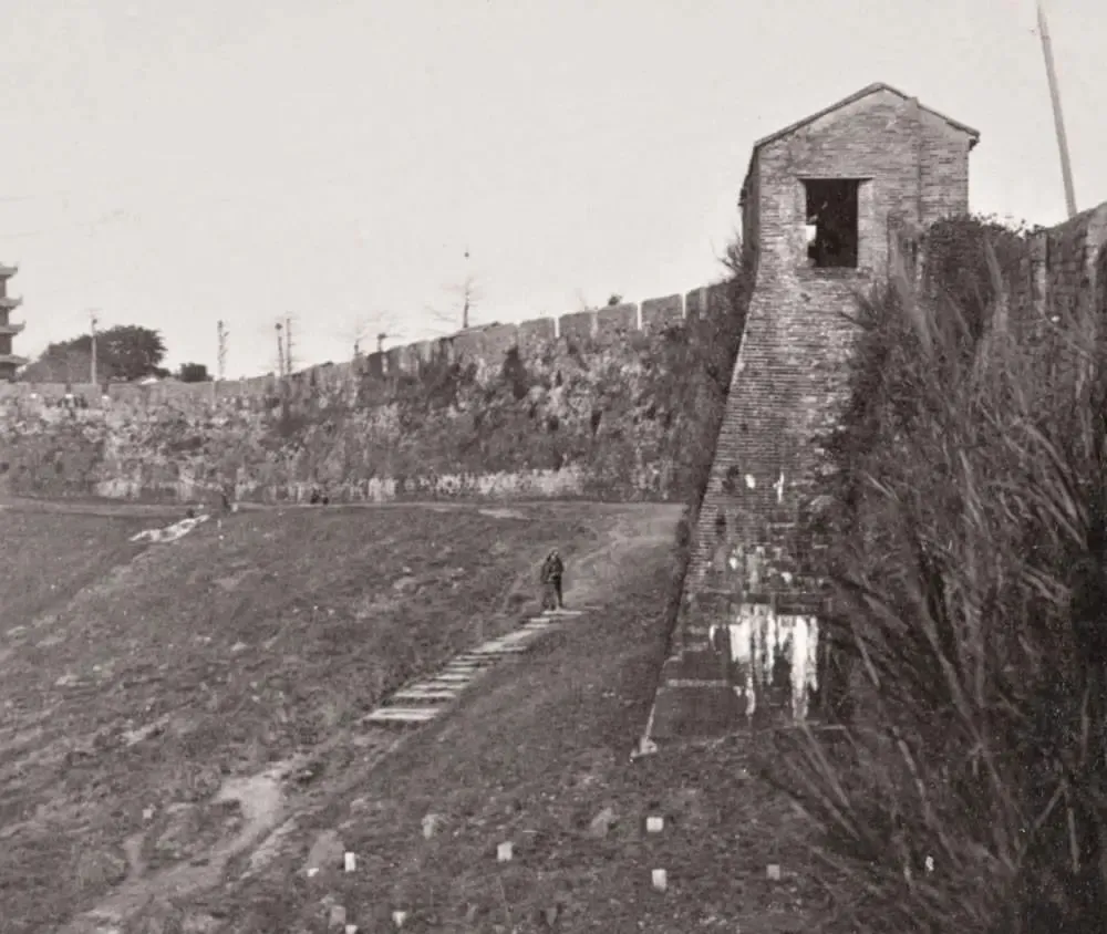 图中这段高高的砖石城垣就叫广州城墙北垣,靠着镇海楼一线延展开去,墙体用青砖砌就,外面斑驳的灰白水痕是一年年雨季留下的记号,右边这座尖屋顶的方形敌台,窗洞黑黑的,像一只眯起的眼睛在看江面,台下石阶顺着坡势往上爬,一个人提着小包慢慢走,步子不急不慢,像城里每天都要重复的家常路。