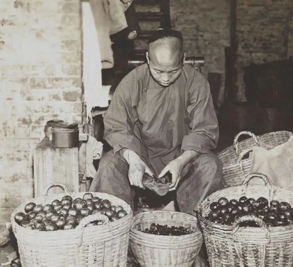 这个蹲着挑果的行当叫做罐头,竹篮一只只摆开,果子油亮,男人拿小刀把坏点削掉,身后的砖墙被蒸汽熏得发黑,案角放着铁锅和秤砣,师傅把果肉泡糖水,再装进听里压盖,火一旺就“嗤”地冒气,小时候感冒了就盼一口罐头糖水,甜得喉咙都不疼了。