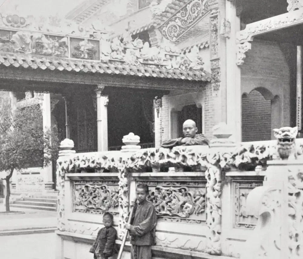 这个金碧的去处叫陈家祠,栏板上全是起伏的龙凤与戏文人物,石栏角上翻出卷草,屋脊压着陶塑,颜色虽被老照片吃掉了,可层次还在,两个小孩靠栏杆打量镜头,眼神亮亮的,老师傅说,这些灰塑木雕一块接一块,先打坯再上色,以前靠手艺吃饭,现在很多靠流量,可真有功夫的活,见一次少一次。