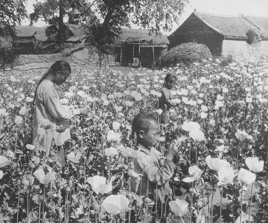 图中大片白花叫罂粟,杆子直直的,叶子边缘锯齿清清楚楚,花盘上开着一圈轻飘的花瓣,风一吹就晃,女人和孩子伸手去划刀口,指尖粘着白色乳汁,等凝成褐色胶块再刮下,奶奶说那阵子有人把好地都拿去种这个,收成来钱快,庄稼就荒了,家里人提起也是长叹一声。