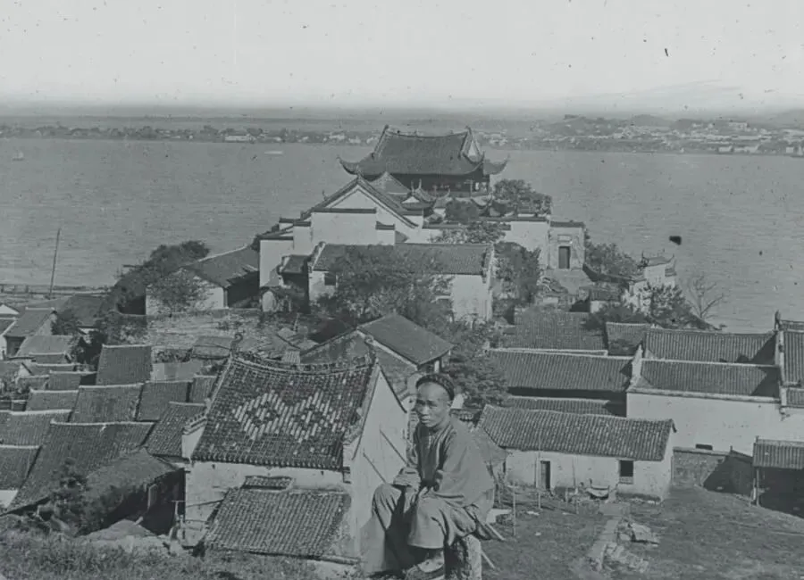 这个临江的高台叫禹功矶,前头的屋顶一片片顺水望去,远处水面亮得刺眼,最高的那座亭台是晴川阁,说跟对岸的名楼相对着,可那会儿旧楼已毁于火,照片里的男人蹲在屋脊上,像在歇口气,城里人下江捞网,上头人看水走云,各自忙各自的。