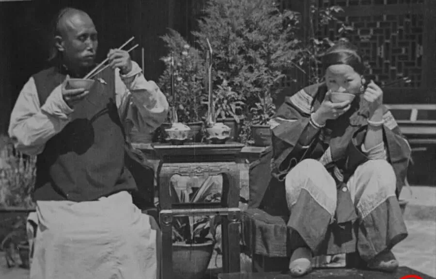 这对坐在院子里的人叫一对吃饭的夫妻,矮几上摆着茶壶和长筒烟,男人把脸微微侧过去,筷子在碗里搅,女人把碗端得很高,眼睛却偷偷斜着看镜头,像是怕它又好奇,桌子不大,影子很长,午后的太阳把一地青砖烤得发热,咱这会儿随手点外卖,他们那会儿一碗饭一碗茶,也能吃出滋味来。
