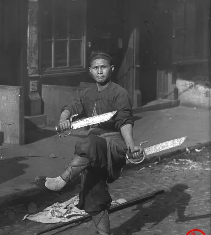 这个双刀的架势叫双刀把式,人单腿立起,脚腕绑着裹腿,胳膊抡起来时袖口鼓一包风,刀背厚,刀脊上有斑驳锈点,阳光一照反起白光,他眼睛盯得直,口里不吭声,脚下的青石板被他跺得咚咚响,小时候看村里卖艺的师傅换项目,一回是枪挑红缨,一回是刀花绕身,旁边人把铜板丢进锣里,脆生生一声响,就是今天的掌声。