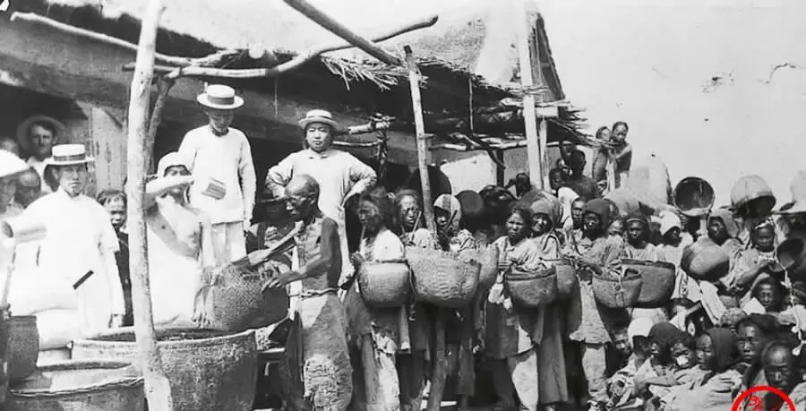 110年前老照片:男青年剪辫子笑容满面,饥民排队领取救济粮。