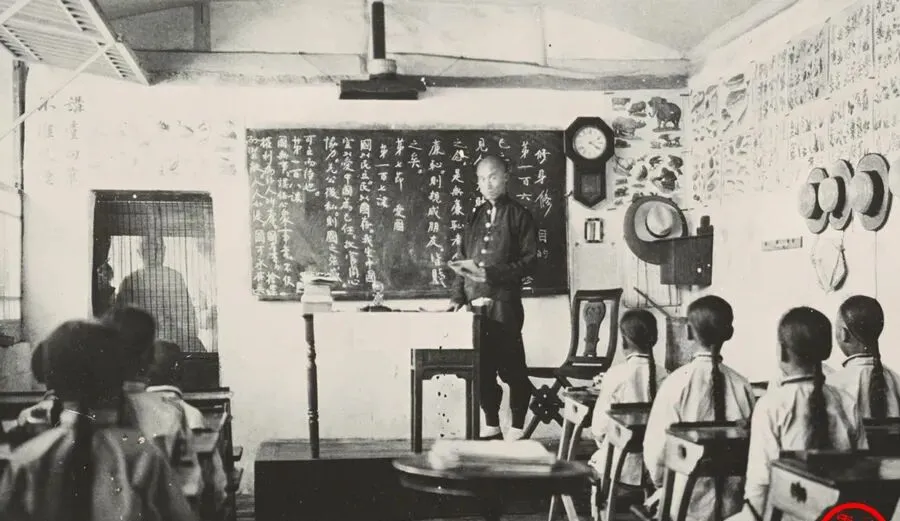 图中这间教室叫新式学堂,那块黑板上的两列字一竖一排写得工整,粉笔渣在讲台边堆着,墙上挂着圆盘挂钟和壁挂话机,帽钩上搭着草帽,老师拿着书讲修身与爱国,念到“国以民立,民以国存”时孩子们坐得直生生的,后窗的身影透进来,像是校役探头看热闹,我外公说那会儿改口不再讲皇恩浩荡,开始说国家与国民的关系,这变化不吵不闹,却能听出一个时代在掉头。
