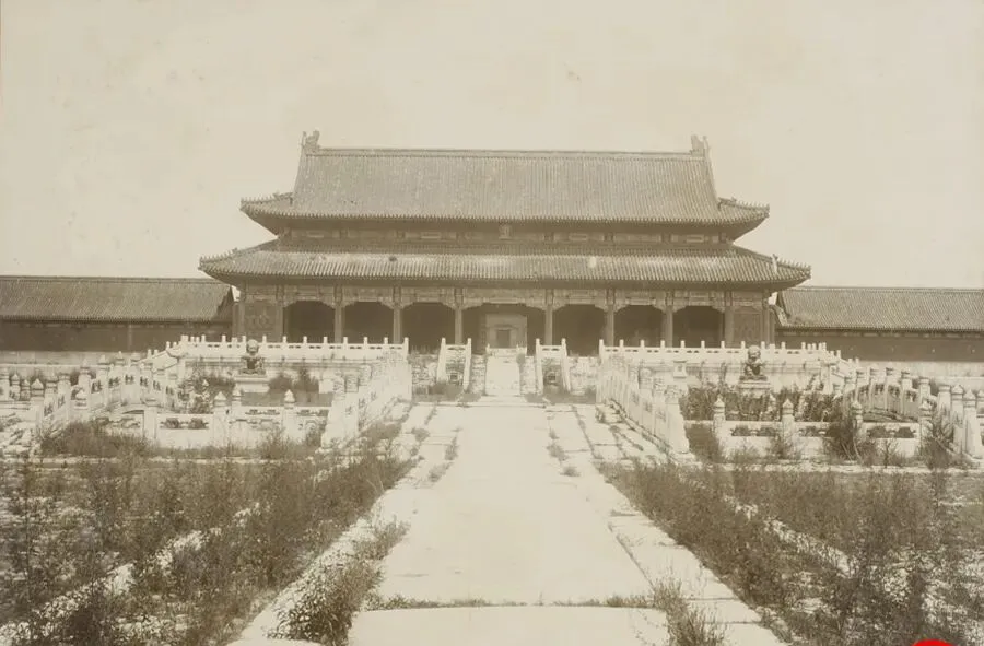 这个场景叫太和门前石阶,石栏一溜儿过去,最扎眼的是路当中齐膝的荒草,石缝里也冒,在阳光下发白,宫墙还是那样红,屋脊还是那样厚,可人气散了,台阶正中空着,像谁走了就没回来,老人常感叹以前宫城威严,现在却给风吹雨打教训了一遍。